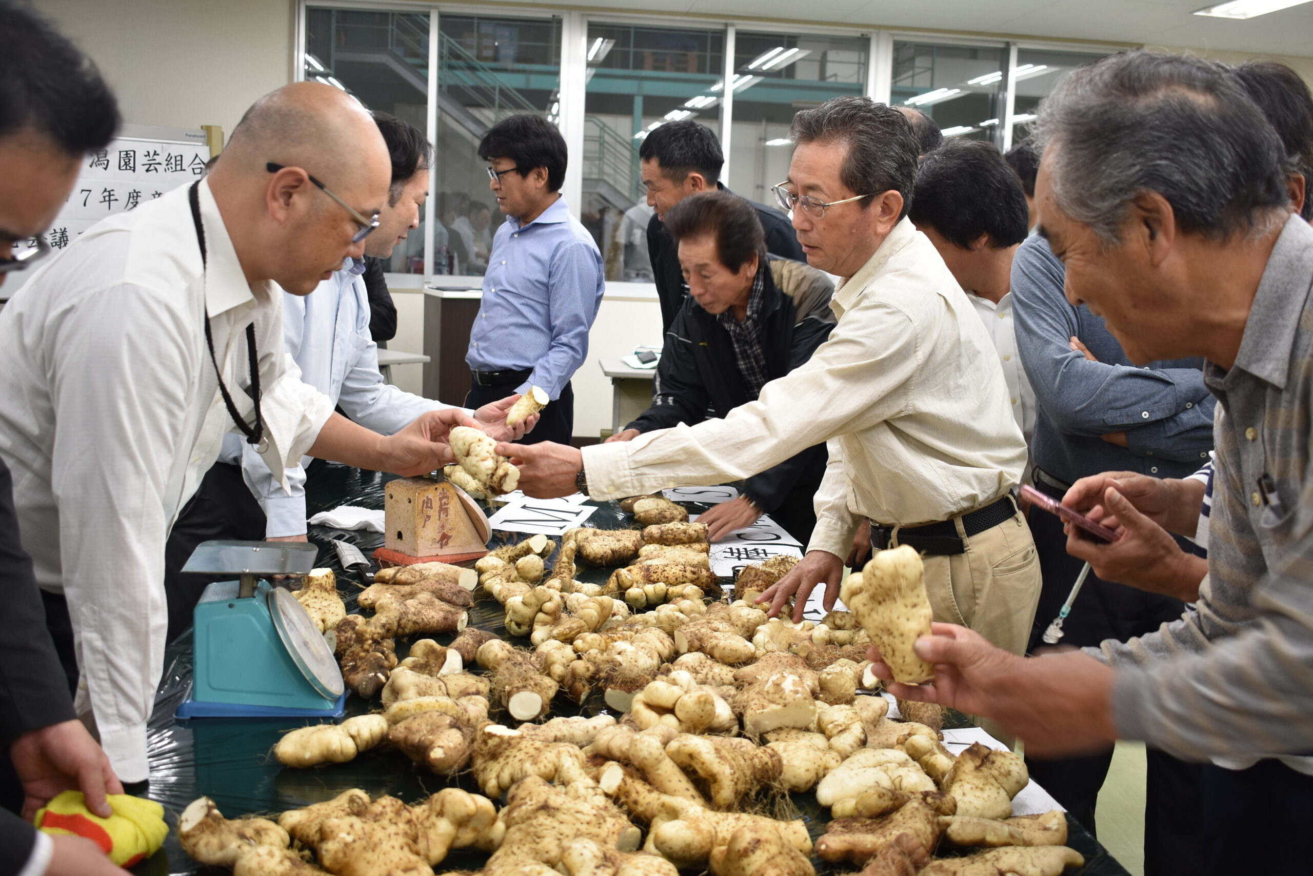 干潟園芸組合大和芋部会(栗栖勇部会長)は10月8日、営農センター干潟で大和芋販売会議及び査定会を開き、指定市場7社、JA全農ちば、生産者15人やJA職員含む計30人が参加しました。