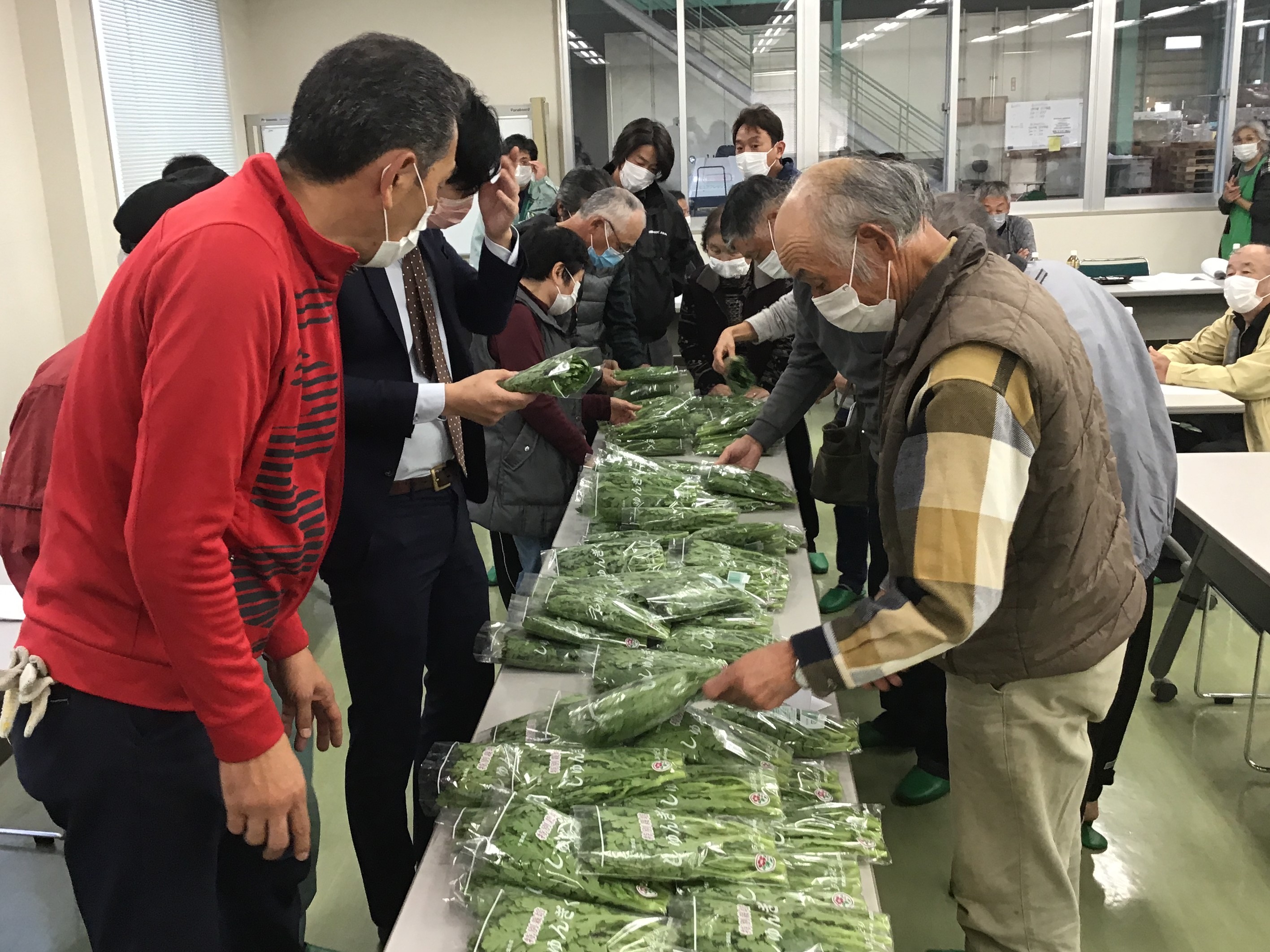 現品査定で市場担当者は「品質はとても良い。干潟の春菊を待っているお客様もおり、選ばれる春菊として、現状を維持して頂き、他産地に負けない高値販売に努めていきたい」と話しました。