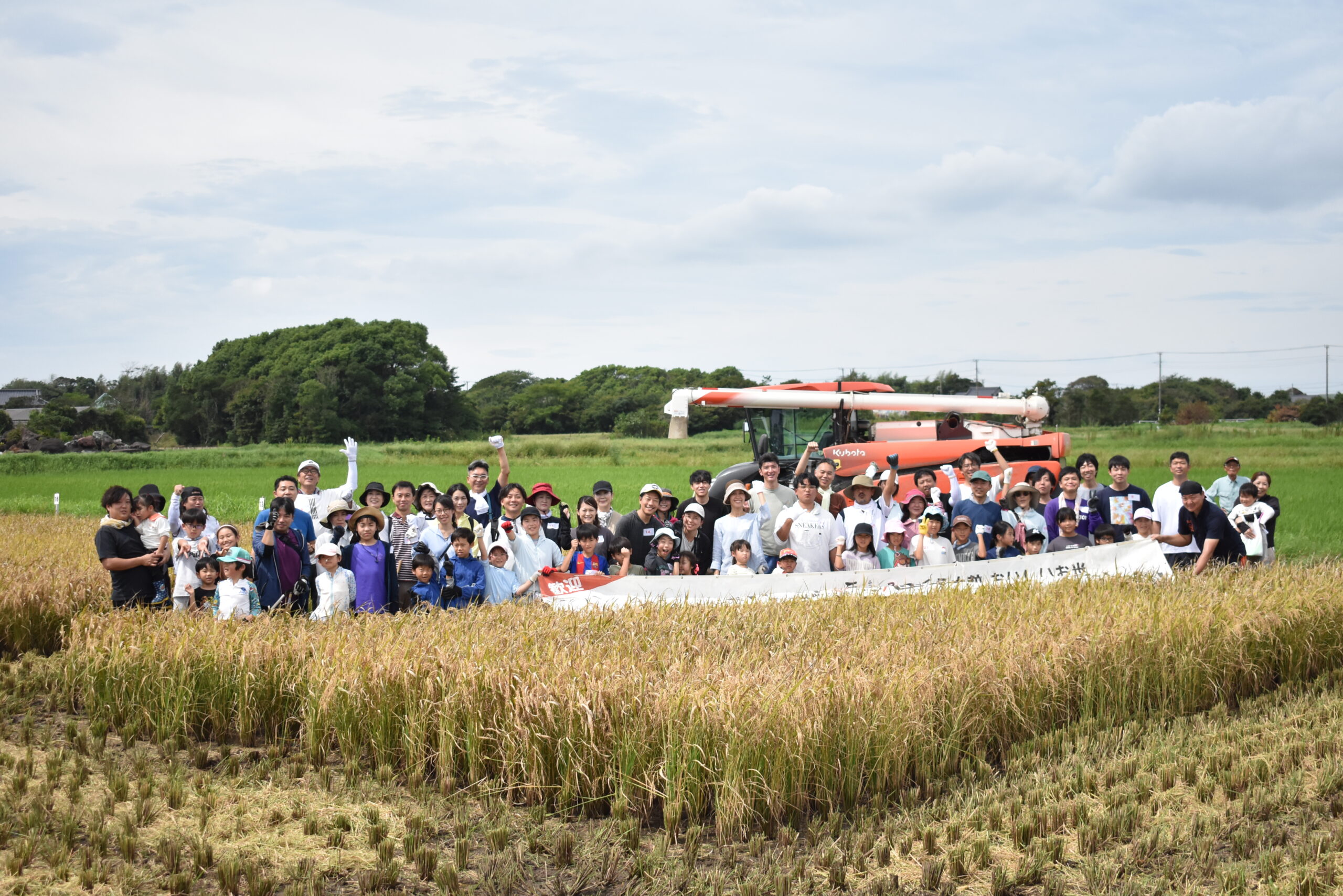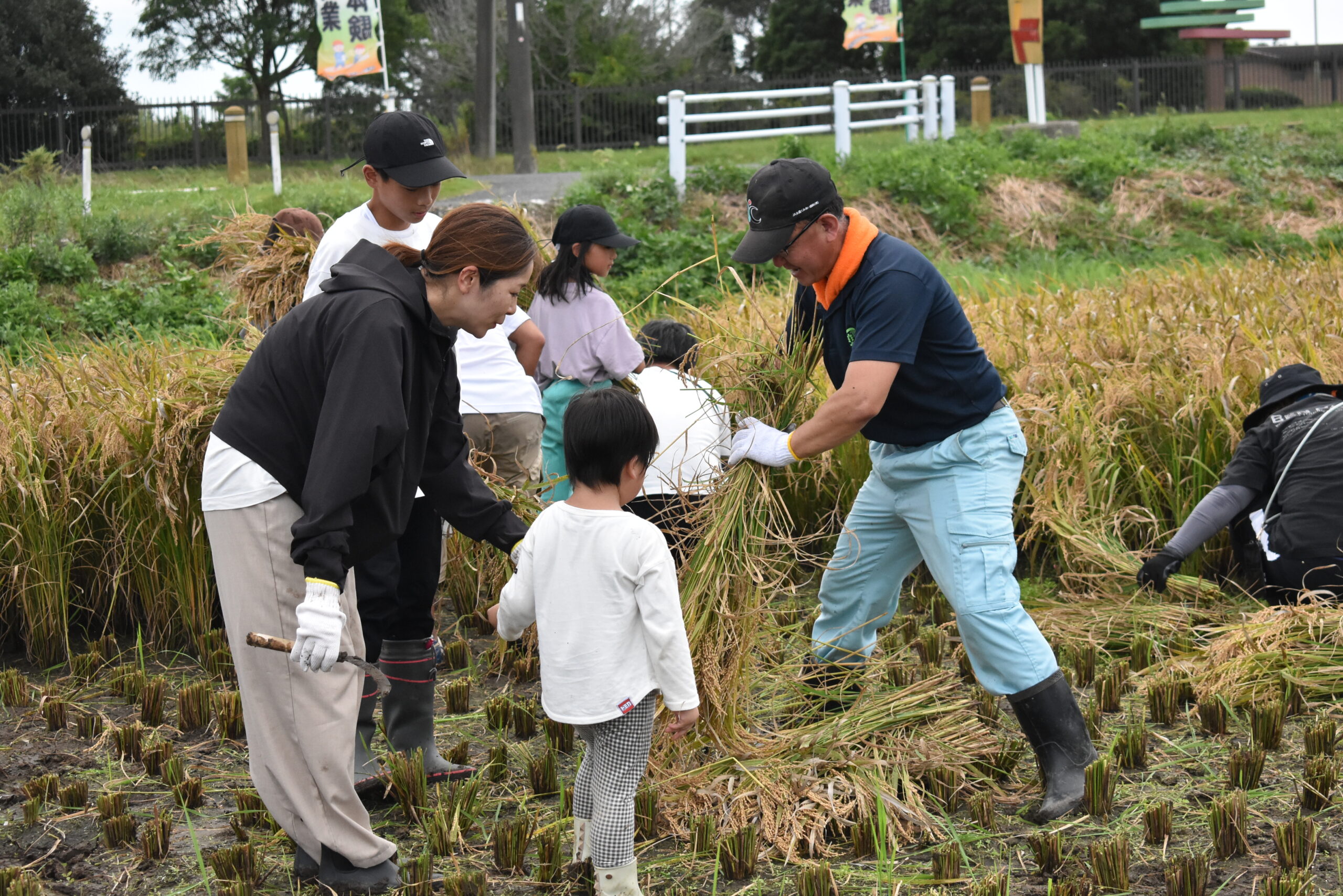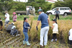 稲刈りでは、親子が鎌を使用し手作業で刈り取りを行い、コンバインで脱穀を行いました。